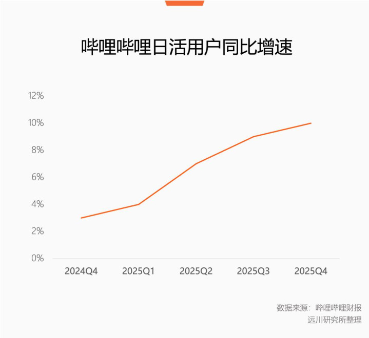 在存量竞争的行业背景之下,B站在2025年第四季度达到8%的月活同比增速,明显高于行业平均水平,日活更是每个季度都在保持增长。