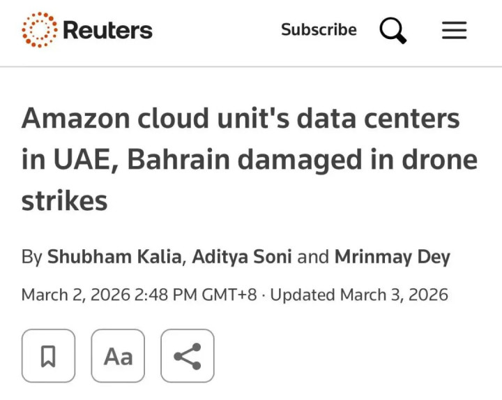 3月1日,亚马逊云服务(AWS)的一纸公告震动了全球科技圈。公告显示,其位于中东的三处数据中心遭无人机精准“点名”。两枚弹药直接贯穿了阿联酋境内的机房顶棚,巴林的设施也没能幸免,在爆炸的余波中陷入死寂。